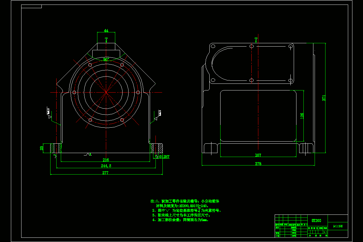 在生产过程中,通过一定的手段使生产对象(原材料,毛坯,零件或总成等)的质和量的状态发生直接变化的过程叫工艺过程。小分动箱体机壳体侧面铣削加工工艺装备的设计应该包括确定减速器整体工艺方案的确定,绘制相应的工序图,加工示意图,机床联系尺寸图。被加工零件工序图是根据制定的工艺方案,表示所设计的组合机床上完成的工艺内容,加工部位的尺寸,精度,表面粗糙度及技术要求,加工用的定位基准,夹压部位以及被加工零件的材料,硬度和在本机床加工前加工余量,毛坯的图样,工序图是组合机床设计的具体依据,也是制造,使用,调整和检验机床精度的重要文件。 加工示意图是在工艺方案和机床总体方案初步确定的基础上绘制的。是表达工艺方案具有内容的机床工艺方案图。它是设计刀具,辅具,夹具,多轴箱和液压,电器系统以及选择动力部件,绘制机床总联系尺寸图的主要依据;是对机床总体布局和性能的原始要求;也是调整机床和刀具所必须的重要技术文件。 机床联系尺寸图是以被加工零件工序图和加工示意图为依据,并按初步选定的主要通用部件以及确定的专业部件的总体结构而绘制的。是用来表示机床的配置型式,主要构成及各部件安装位置,相互联系,运动关系和操作方位的总体布局图。用来检验各部件相对位置及尺寸联系能否满足加工要求和通用部件选择是否合适;它为多轴箱,夹具等专用部件设计提供重要依据;它可以看成是机床总体外观简图。由轮廓尺寸,占地面积,操作方法等可以检验是否适应用户现场使用环境。夹具图是对组合机床加工布局的完整描述,夹具图反映了工件加工采用定位的方式,夹具方式等一些重要的参数。工艺方案,工序图,加工示意图,机床联系尺寸图,夹具图,工序卡基本构成了完整的加工工艺装备设计