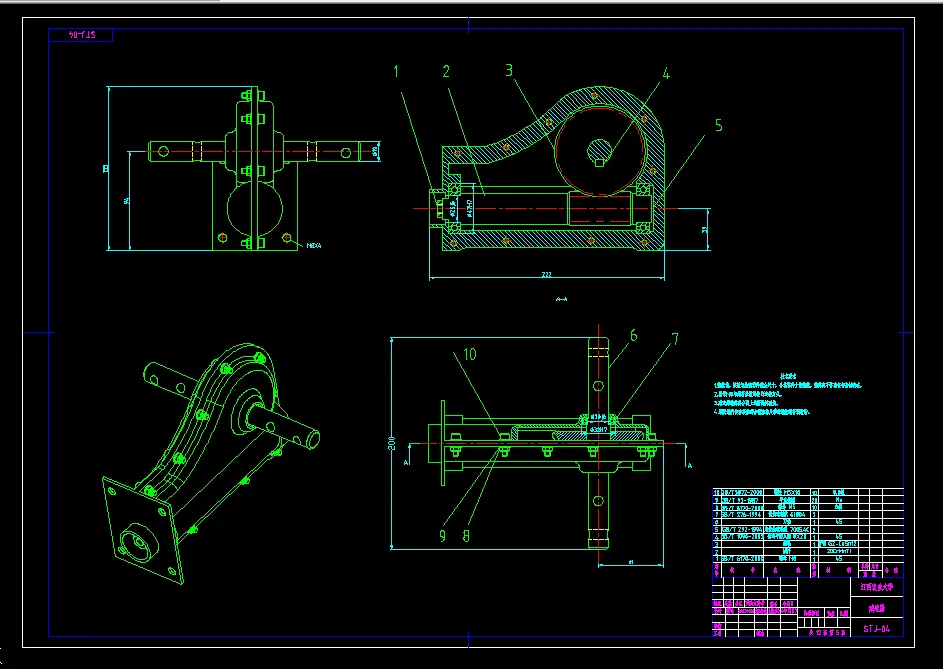为减轻整机质量和减小外形尺寸以及降低造价,在满足使用要求的前提下,用螺纹连接代替传动轴与蜗杆的联轴器连接,蜗杆蜗轮减速器的结构也进行了简化,省去一般要求的油箱与风扇。
