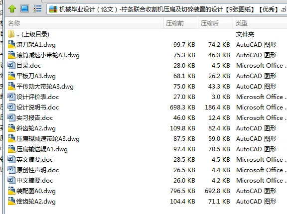 整个机构中,压扁输送辊和滚筒切碎装置本次设计的重点,两部分均采用立式安装,使整体机构变的紧凑,节省了空间,与前面的往复式切割系统能够很好的配合。此柠条联合收割机的设计为柠条的联合收割提出了新的方式,为后续的设计和研究提供了一个较好的方向。
