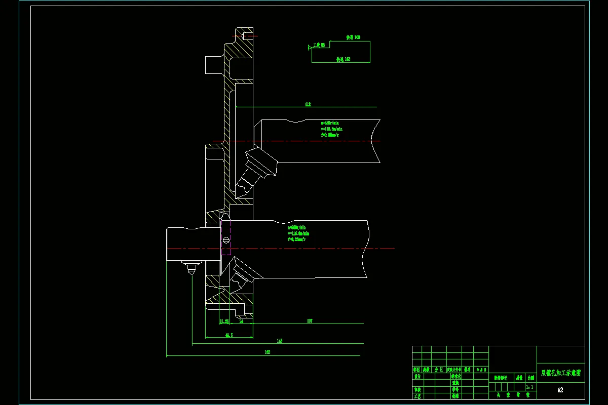 改装后的机床采用镗杆旋转、工件进给的方案,机床的主运动和进给运动借助原车床的运动关系进行。设计加工用专用主轴箱安装在车床导轨上,卸掉原车床的卡盘,将专用主轴箱与车床主轴联接,通过专用主轴箱使原车床的单主轴输出转变为双主轴输出,联接镗杆,同时镗削工件.上的两孔。拆去原车床的刀架和尾座,设计的专用夹具安装在车床熘板上。通过熘板的纵向进给实现加工时的工进。