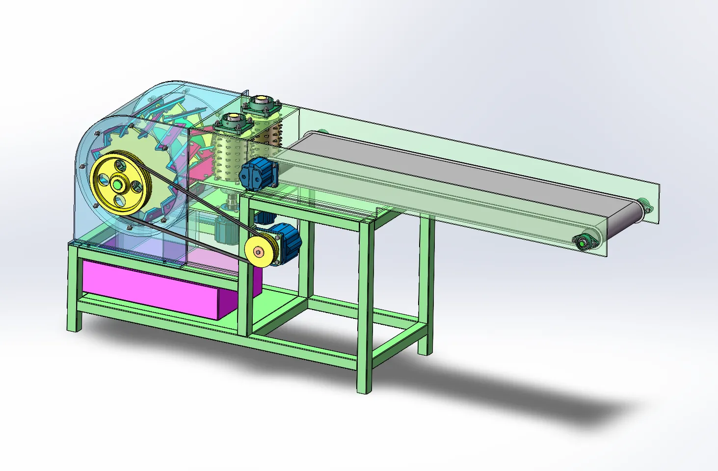 食品初加工机械,它是由机架、电机、皮带传动系统、减速器、联轴器、链轮传动系统、轴承、螺旋式滚筒、冲洗水管