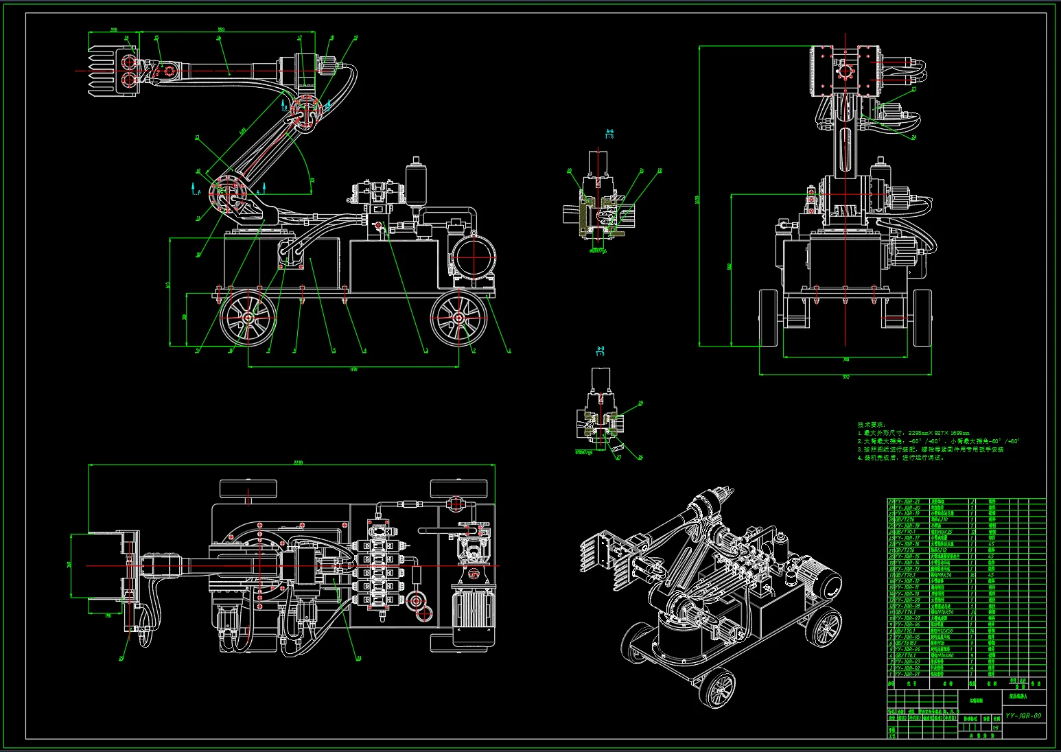本设计包含整体所有零部件以及装配的三维SW2018设计,包含液压系统原理图设计,液压机器人的装配图设计,液压管路图设计,参数设计计算,液压系统参数计算,受力分析等。
