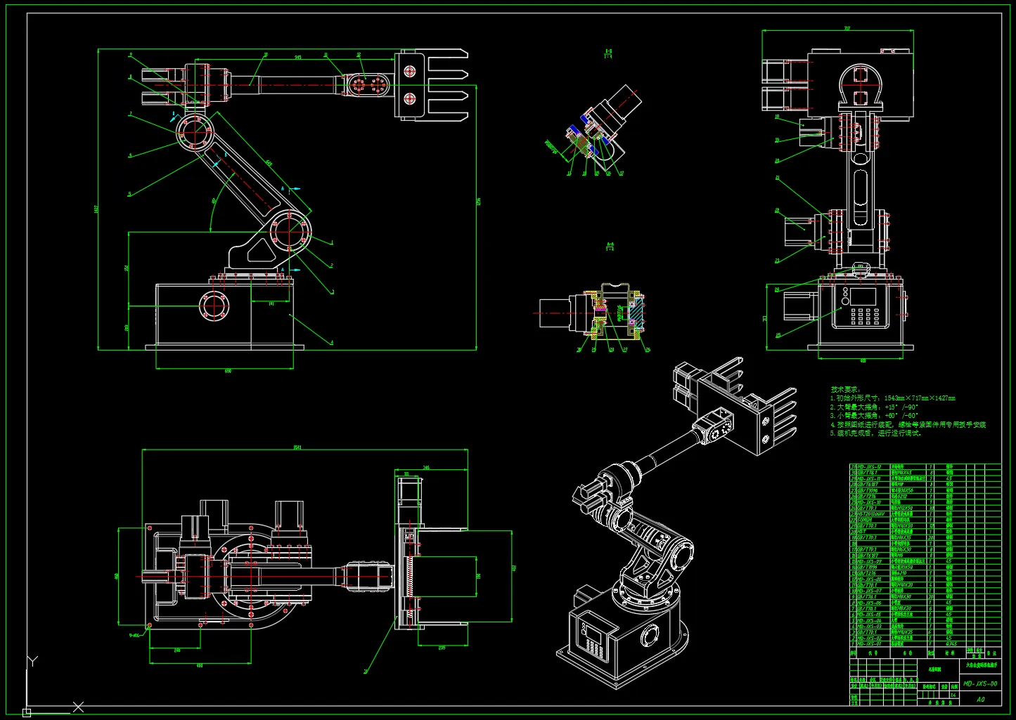 包含三维SW2018零部件以及总装配,包含二维CAD图纸。 初始外形尺寸:1543mm×717mm×1427mm 大臂最大摆角:+15°/-90° 小臂最大摆角:+60°/-60° 抓取物体宽度:(200-400)mm 自由度:6 底座旋转:360°,角速度:2.6rad/s 大臂俯仰:角速度:2.6rad/s 小臂俯仰:角速度:2.6rad/s 小臂旋转:360°角速度:3.14rad/s; 腕部摆动:角速度:2.6rad/s 提取重物:50kg(500N) 自重:60kg