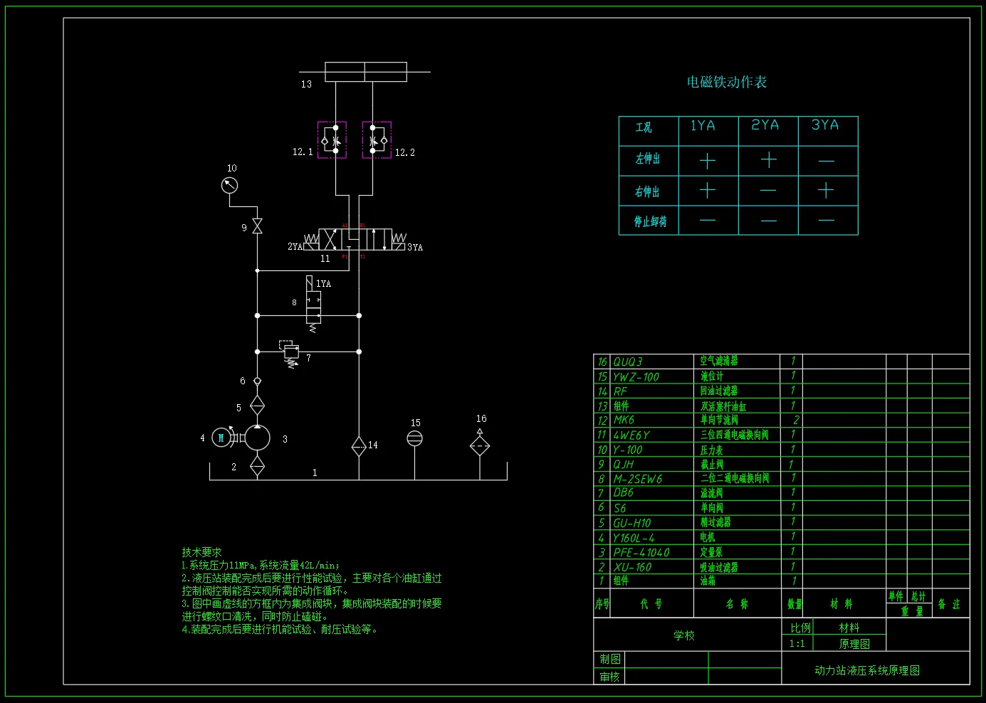 液压动力站设计,包含液压系统原理图设计,阀块设计,油箱焊合设计,钟形罩设计,设计计算书等,参数为:系统压力为11MPa,系统流量为42L/min。