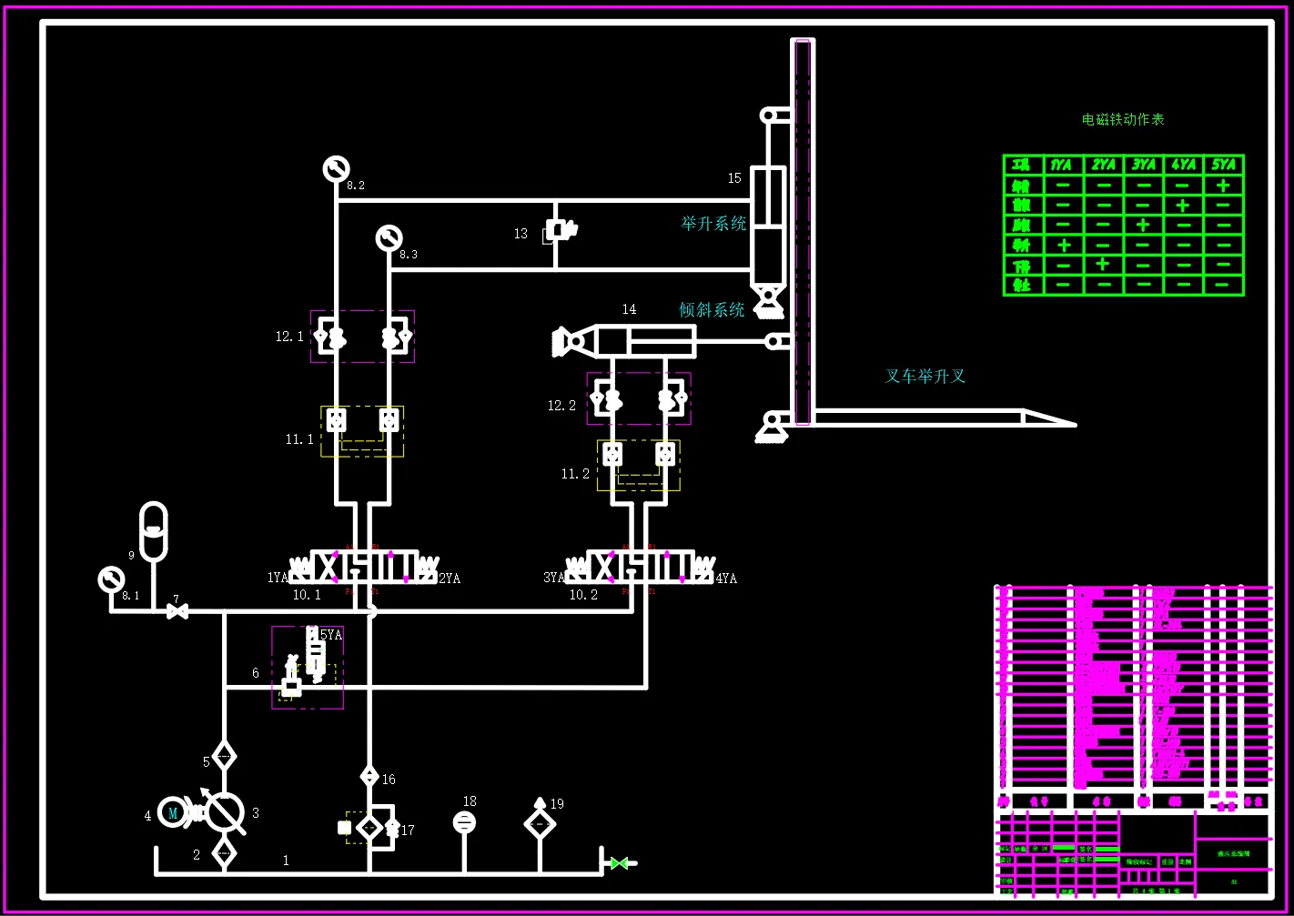 叉车工作装置液压系统,包含二维CAD举升油缸装配图,活塞杆,缸筒焊和,负载和速度图,液压系统原理图等,包含设计计算书。最大提升力为55KN,提升高度1.8m,升降装置自重3KN,最大提升速度0.18m/s
