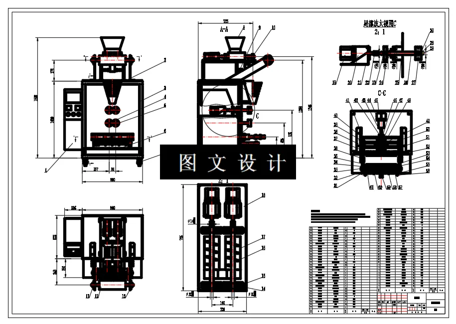 双色配比包装机,属于多色混合配比包装。进行了设计方案论证、包装原理分析、机械结构设计和强度计算等。颗粒包装机主要由颗粒料仓、定量供料绞龙、包装薄膜供给、成型、纵封、横封、切断等组成,其工作原理是薄膜卷装在轴上,进入薄膜导向成型器,形成对折的U形结构。进而,纵封辊将薄膜横封成筒状,横封辊将筒状薄膜的底部封口,制成敞口袋,供料机构向敞口袋内充填物料,然后横封辊将敞口袋的口封合,切割装置的切刀将连续包装袋切成单袋,完成包装过程。