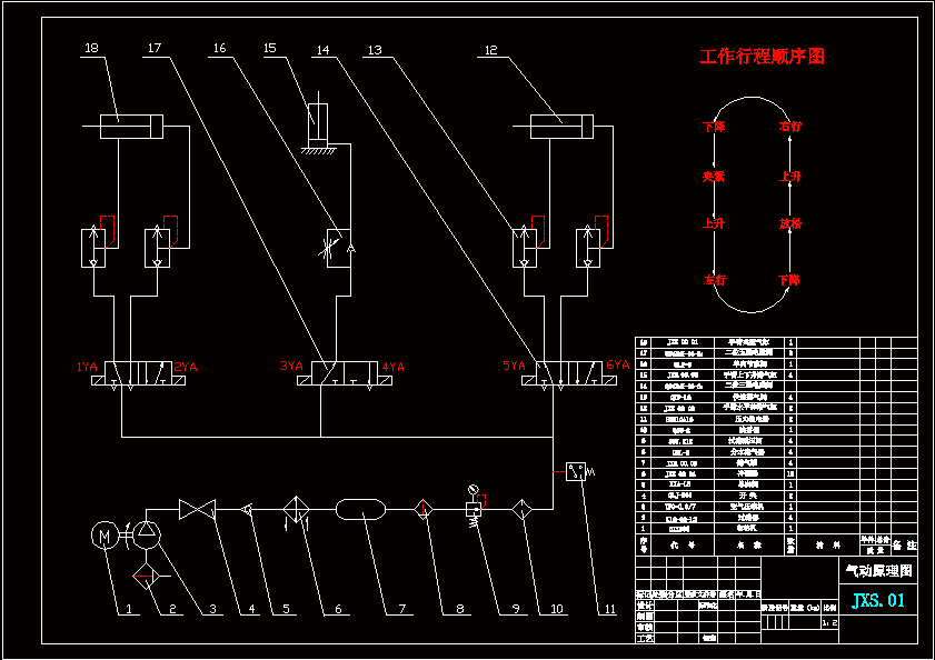 根据设计要求:气动机械手的自由度为2,,可搬运最大直径为50mm的圆柱体或最大宽度为70mm的板材,水平搬运距离500mm,垂直搬运距离200mm。可知,整个系统需要三个气缸:手爪夹紧气缸1,水平伸缩气缸2,上下升降气缸3。图示为本设计机械手演示装置的动作示意图。该机械手是一个水平/垂直位移的机械设备,可以实现将工件由A工作台搬运到B工作台。