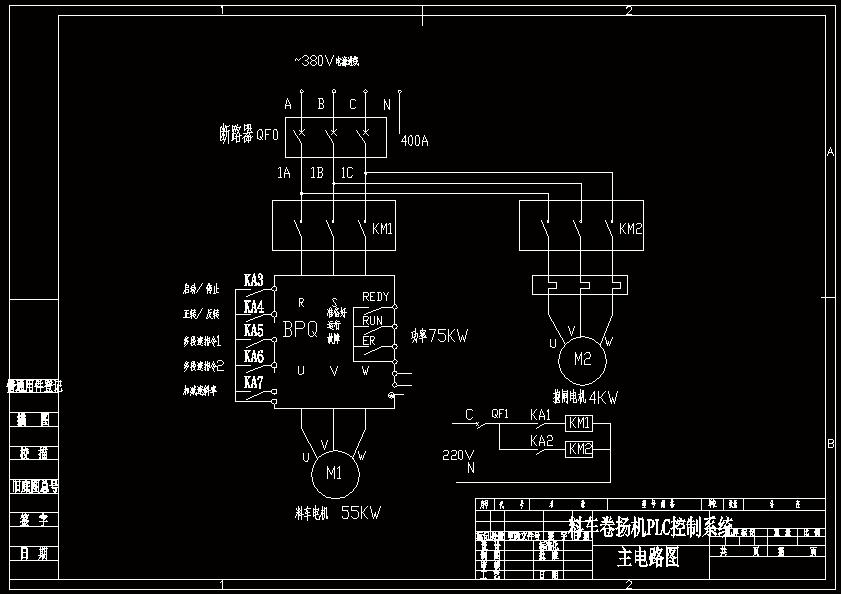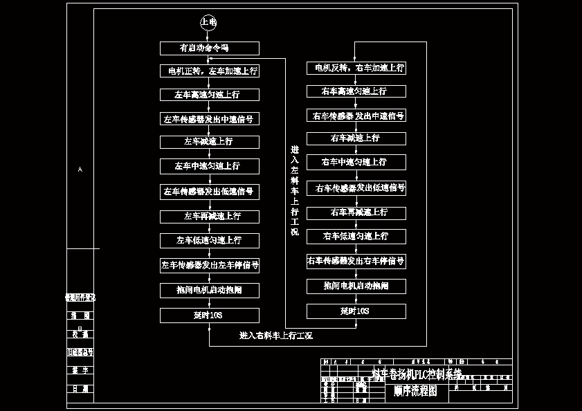 基于PLC与变频器的料车卷扬机调速控制系统设计 该设计还采用了变频器6SE70装置中的抱闸专用控制功能来实现料车运行中抱闸控制与联锁控制。PLC控制系统以西门子S7200PLC作为控制核心,采用光电隔离,数字滤波,数据断电保持功能。明确了调速控制分为高速、中速、低速三段速的设计思路,设计了基于西门子6SE70变频器的变频调速控制系统。电气部分设计了主电路和PLC控制电路,对电气部分元器件进行了参数计算和选型。详细介绍了PLC控制系统CPU模块的硬件组成,绘制了PLC模块端子接线图,绘制PLC软件程序流程图。设计了友好的人机界面,一些设定参数可以通过大屏幕输入,传送到PLC,系统工作的实时状态和数据也能在大屏幕上显示出来。本设计描述比较详细,硬件选型合理,接线图纸准确,提供了部分软件程序流程图和人机界面画面。满足了上料卷扬机对调速控制的要求,精确控制料车运行位置,确保了料车的安全稳定运行。