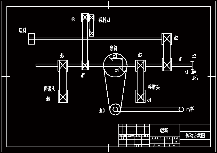 螺钉头冷镦机设计 设计为螺钉头冷镦机,能够实现自动机料、截料、冷镦,每分钟冷镦螺钉头120只,生产效率高。驱动方式采用带传动形式,传动平稳,设计简单。本设计螺钉头冷镦机工作时原坯料由摩擦轮带动送入分度圆盘,分度圆盘间歇转动,当其不转时,冷镦机依次完成送料/顶料、截断原料、预镦、终镦这四个动作,其中送料和顶料通过同一动作完成。本设计首先确定出总体设计思路,并列出主要设计参数。然后,分别进行了螺钉头冷镦机的送料机构、截料机构、夹紧机构、冷镦机构和传动机构等常用设计方案的评定和选择,并绘制传动方案图和机械运动简图,按工艺动作顺序和协调要求拟定运动循环图。