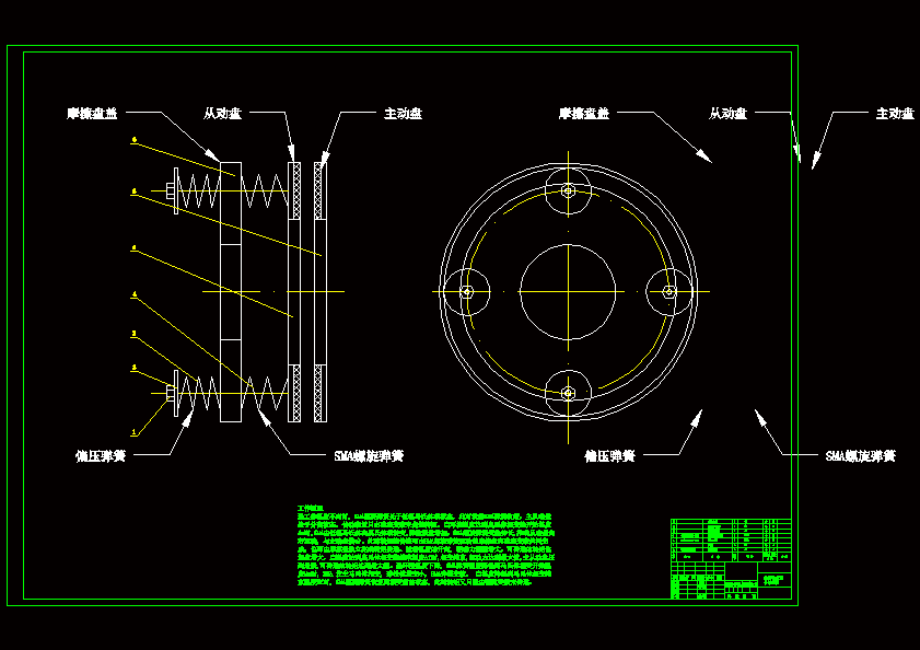热效应下形状记忆合金和磁流变液交替传动装置设计 主要讲述磁流变液的流变特性和形状记忆合金的形状记忆效应,在分析了上述的理论基础上,结合机械设计的方法,本文将筒式磁流变液传动装置作为主要传动部件,摩擦盘传动部件作为筒式磁流变液传动装置的辅助传动装置,将SAM螺旋弹簧双程驱动器件应用于驱动主从动摩擦盘的接合和分离上,实现摩擦盘的感温控制,设计出了一种新型的性能优良的传动装置。