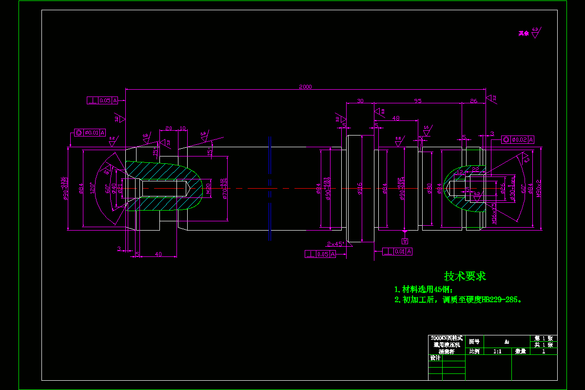 作为世界加工中心,我国机械工业在国民经济中的基础作用越来越明显。液压机技术水平的高低直接影响到国家机械工业的发展水平。四柱式通用液压机是液压机产品的一个重要组成部分,拥有自主的液压机设计技术是使国家机械工业能在世界竞争中取胜的重要保证,对其展开研究有重要的理论和实际意义。 本文完成了2000KN四柱式通用液压机本体的设计,并采用二维制图软件AutoCAD对其进行研究。说明书提出了2000KN四柱式通用液压机的技术参数,拟定了机器的结构形式,着重对工作缸做了结构设计和数据计算,对液压机工作缸柱塞和活动横梁的结构连接以及回程部分进行了简要设计。根据液压机设计理论完成了整体机架结构及主要结构部件的设计与理论计算并详细讨论了该机器的预紧问题。对液压机本体的总体结构和的关键部件进行了强度计算与分析,主要内容包括:结构中应力集中情况分析,初始设计方案修正,最终获得了满足强度和刚度要求的机架设计。最后利用AutoCAD软件对2000KN四柱式通用液压机总装配图及主要零部件进行了设计,完成了液压机的整体结构设计。