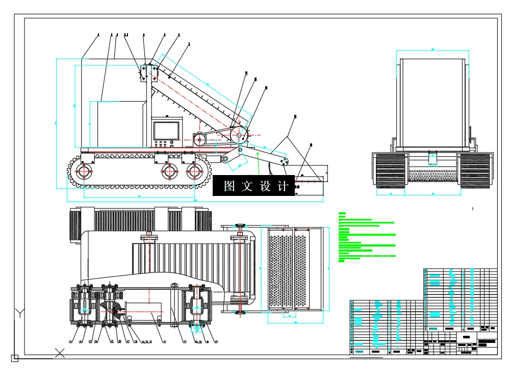 沙质土壤分布区,枣、杏、沙棘等林果作物的自然落果现象普遍存在。受风力作用、成熟度不均衡或采摘不及时等因素影响,大量果实脱离枝干散落于地表,形成具有经济价值的“落地果”。此类果实因接触沙土易受污染、霉变或虫蛀,需及时采收以保障商品价值。然而,当前沙地落地果的收集作业仍以人工捡拾为主,劳动者需在松软沙土中长时间弯腰劳作,日均作业面积不足0.5亩,效率低下且劳动强度极高。本研究针效率低、成本高的技术瓶颈,以沙质土壤落地果实收获装置为研究对象,开展结构与传动系统的创新设计。基于机械-沙地相互作用模型,通过方案对比分析,用推土机式工作结构,捡拾机构机构由铲斗,液压油缸,铲斗将果实推入斗内,液压油缸通过连杆机构,连接铲斗,获取果实。输送带机构由柔性带体、驱动滚筒、惰轮及条状橡胶挡板构成核心组件。装置通过主动轮旋转带动环形带运动,从动轮维持张力平衡,隔板防止物料滑移。主动轮带动传送链将果实投入果实收集盒。完成行走机构、动力系统及关键部件的参数化设计。采用理论建模与工程校核相结合的方法,优化传动系统。