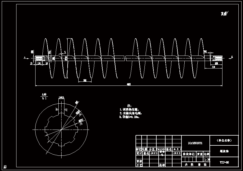 水平式螺旋预煮机是利用螺旋输送原理实现果蔬连续预煮的设备。在工作过程中.果蔬原材料被连续地送到预煮机加料口后,便被预煮机中的螺旋推送到出料口。物料在预煮机中披浸在热水或沸水中,以避免与空气接触产生褐变,同时获得均匀—致的预煮效果。 本人首先根据设计要求以及预煮技术对各个执行机构和传动机构进行选择。在此基础上,初步确定水平螺旋预煮机由动力传动装置、预煮装置、螺旋输送装置、出料装置与连接支撑装置等几部分组成。动力装置选择了调速电机,减化了传动装置,提高了设备效率;预煮装置是由蒸汽管将热量传递给筒体内的水,完成预煮过程;螺旋输送装置是在满足预煮的前提下确定螺旋的相关直径与长度,同时对螺旋轴进行了结构设计,保证其能方便制造与安装;出料装置是保证预煮好的物料顺利地从热水中沥出来并输送出去;连接支撑装置上,采用了螺旋轴孔与花键连接,花键可以缓解螺旋轴因受热的轴向伸长。 设计重点是螺旋输送装置和连接支撑装置等。传动装置的设计中的电机、齿轮、轴的选择、设计与校核也进行了必要的设计说明。