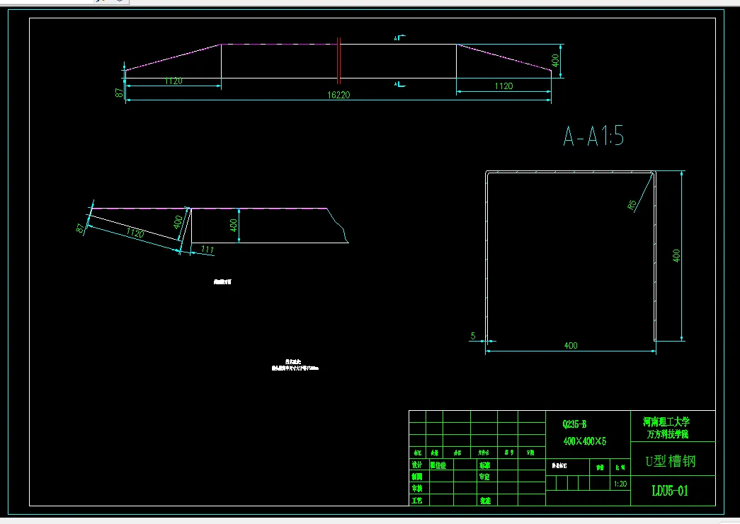 我做的毕业设计课题是单梁桥式起重机设计。单梁桥式起重机是一种轻型起重设备,它适用起重量为1~20 吨,适用跨度4.5~16.5米,工作环境温度在≥-35。C与≤+35。C范围内,适合于车间、仓库、露天堆场等处的物品装卸工作。桥架由一根主梁和两根端梁刚接组成。根据起重量和跨度,主梁采用普通工字钢和U形槽组合焊接形成。主梁和端梁之间采用承载突缘普通螺栓法兰连接。提升机构采用CD型电葫芦。