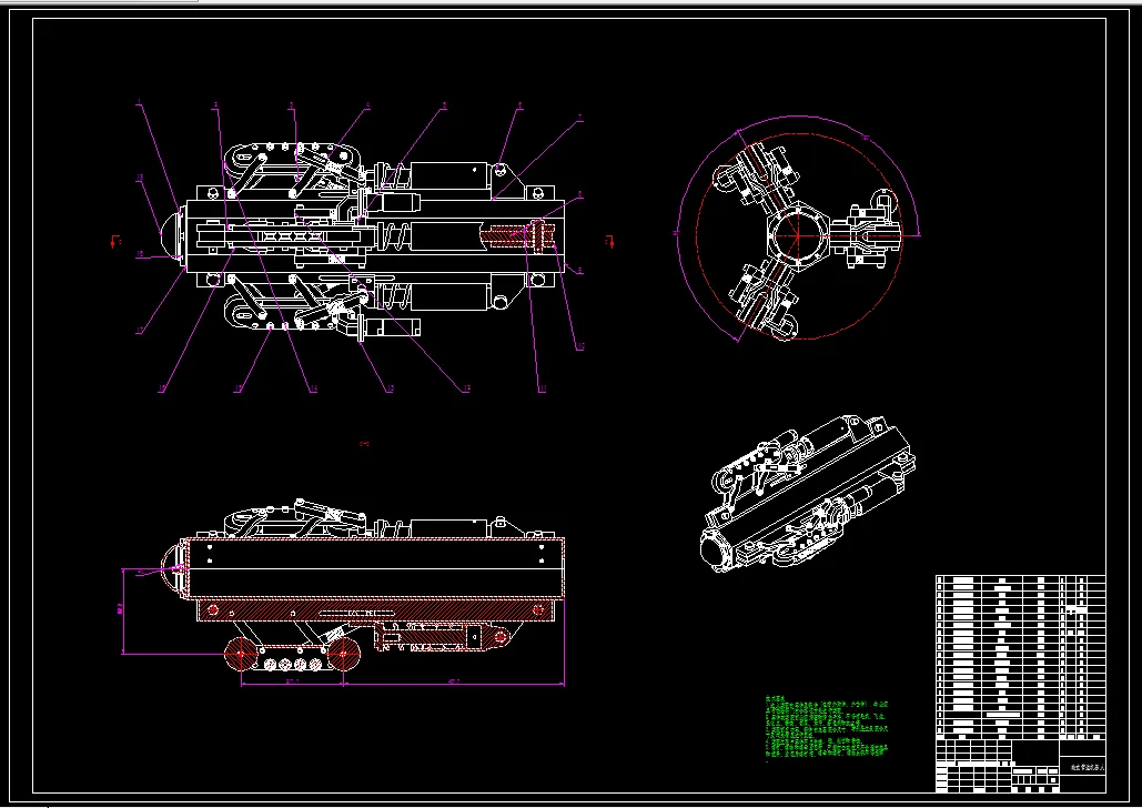 该论文主要研究了轮式管道机器人的结构设计。首先介绍了变径管道检测机器人课题的提出和管道机器人的种类和发展。然后明确了本课题的主要设计内容和预期设计结果。在方案设计部分,详细描述了变径管道检测机器人的设计思路、变径方案、传动方案以及主要结构和工作原理。接着对变径管道检测机器人的主要部分进行了设计,包括变径机构设计、外壳设计和轮组设计。在电动机的选择部分,讨论了移动电机和变径机构电机的选择。随后进行了变径管道检测机器人零件选型校核,其中包括滚珠丝杠选型校核、联轴器的选择和丝杠轴承的选择。最后总结了研究结果,并展望了未来的研究方向。本论文的研究结果将为轮式管道机器人的结构设计提供指导,具有一定的实际应用价值。