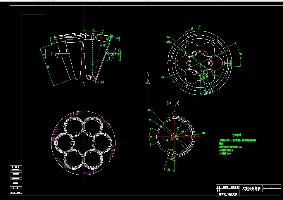 集尘分离装置部分,其由两组旋风分离器构成:上游旋风分离器、下游旋风分离器。上游旋风分离器分离颗粒较大的灰尘、杂质。气体通过中间的网孔进入下游旋风分离器。下游旋风分离器由6个小旋风分离器并联构成,通过采用并联技术,可大大提高分离效率。对下游小旋风分离器的外观尺寸、倾角设计进行了的详细介绍。
