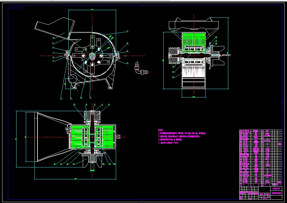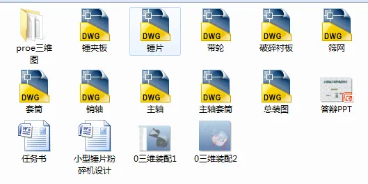 本次毕业设计是完成小型锤片粉碎机的设计。采用落料拉深、胀形整形、冲孔挤边工艺。设计中分析了粉碎机的构造及工作过程、粉碎机运动分析、粉碎机总体设计、传动系统设计,并绘制了pro/e零件图和装配图,同时绘制了CAD零件图和装配图。在粉碎机的设计中,本文对粉碎机的各个机构进行了运动学和动力学的详细计算,并对V带进行了严格的校核计算,确定了电机、联轴器和皮带等的具体参数。