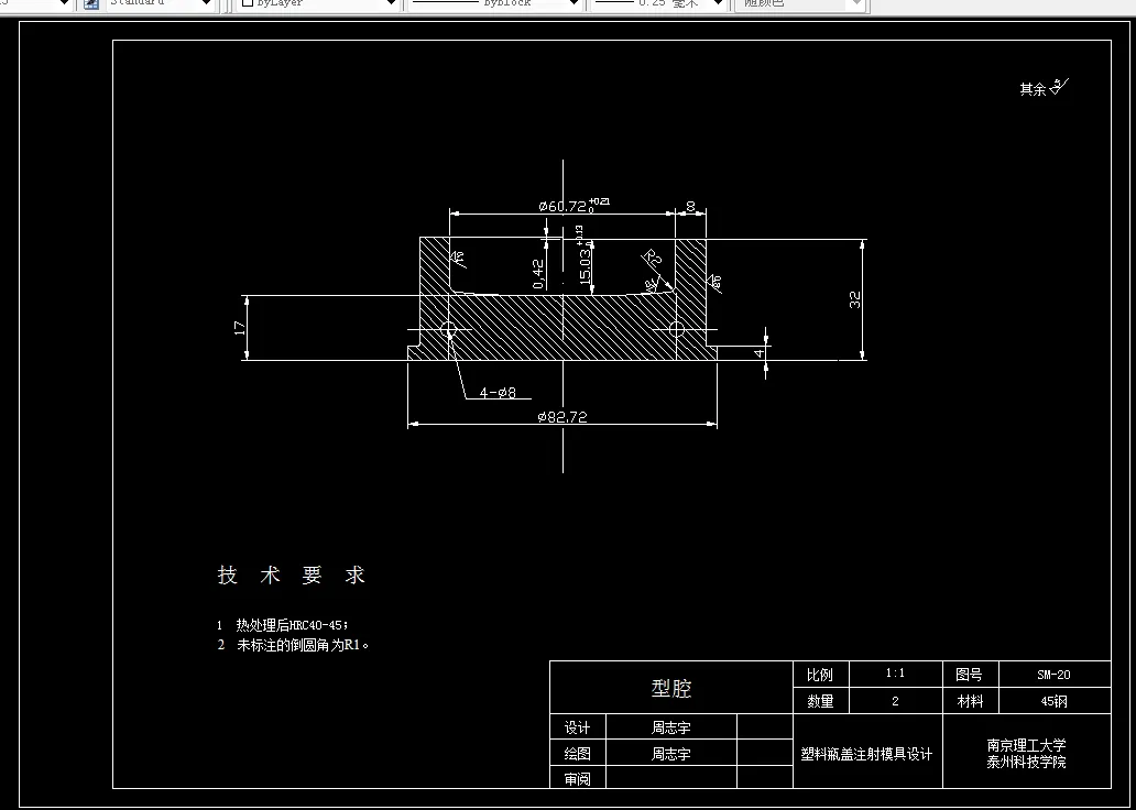 本论文根据工程实际的需要完成化妆品盒盖的注射模具设计。在设计中采用聚乙烯塑料注射而成型,成型方式为一模两腔,该论文具体分析了产品的工艺性,确定了所采用塑料的工艺参数和所采用的成型设备,确定了模具制作的总体方案,分析并解决了模具的总体结构和各工作部分的具体结构,并进行了一些必要的尺寸计算和强度的校核。该论文还对分型面、浇注系统和脱模机构进行了分析设计,完成了模具工程图设计,最后进行了主要零件加工工艺设计。