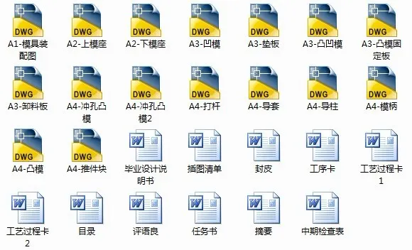 本设计运用冲裁工艺及模具设计的基础知识,首先分析了板材的性能要求,为选取模具的类型做好了准备;然后计算了冲裁件的冲裁力,便于选取压力机吨位及确定压力机型号;最后分析了冲裁件的特征,便于确定模具的设计参数、设计要点及卸件装置。