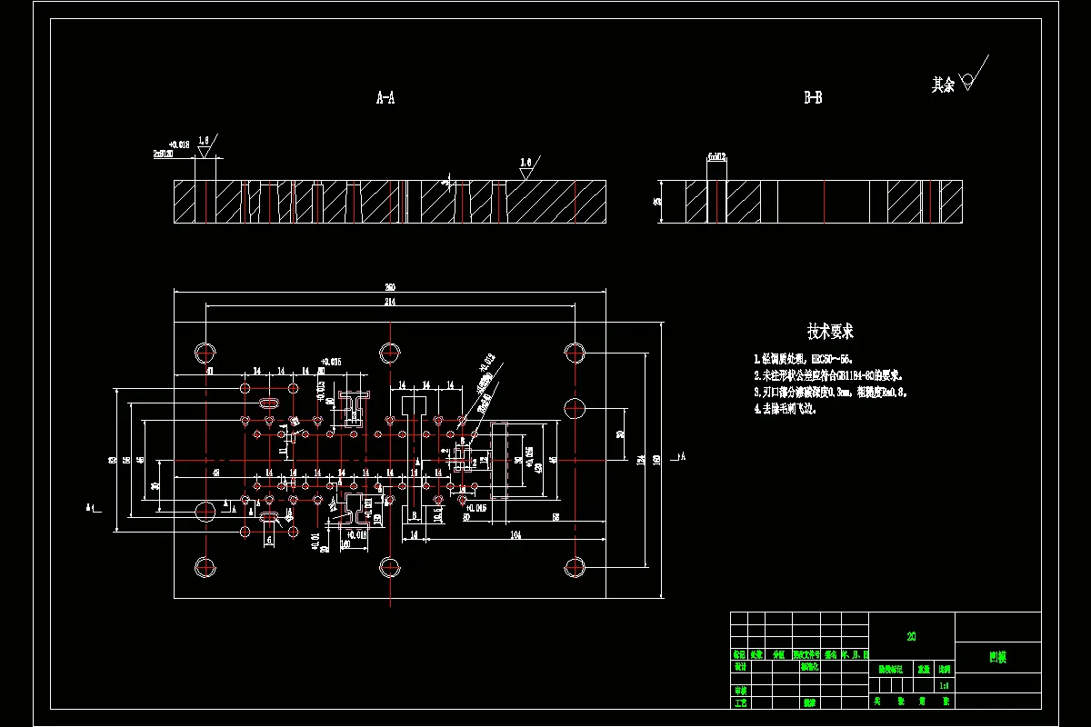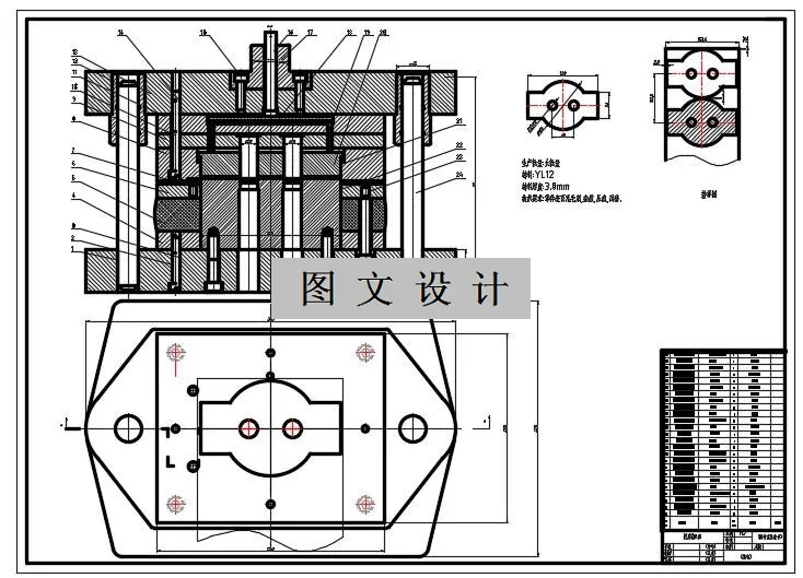 连接片模具设计时,首先要设计正式装配图,再绘制每个零件图。绘制装配图,在装配图中,要确定模具所使用的模架形式(包括导向系统),卸料结构,导料装置,送料和步距方式,凸、凹模的结构形式及固定方法等。对模具零件图一般是指非标准件或采用标准件需要局部加工的地方,这些零件均需绘制,模具零件图视图的多少,以能看明白图形为标准。由于多工位级进模结构复杂,因此设计完图样后应附有一份简明的说明书,包括选用冲床、模具闭合高度、模柄直径、轮廓尺寸、规定行程范围、每分钟冲压次数、选用自动送料机构的型号、送料步距和步距公差等,还要说明安装调整要点。在说明书中要明确模具刃磨和维修的注意事项,如哪些凸模、凹模镶件要拆下刃磨,在刃磨后需调整的各工作部分的相对高度值等。要有易损件、备件明细表等。模具完成后,装配图和零件图都要编号并必须进行校核,校核工作很重要,它对减少差错,提高质量是有益的。