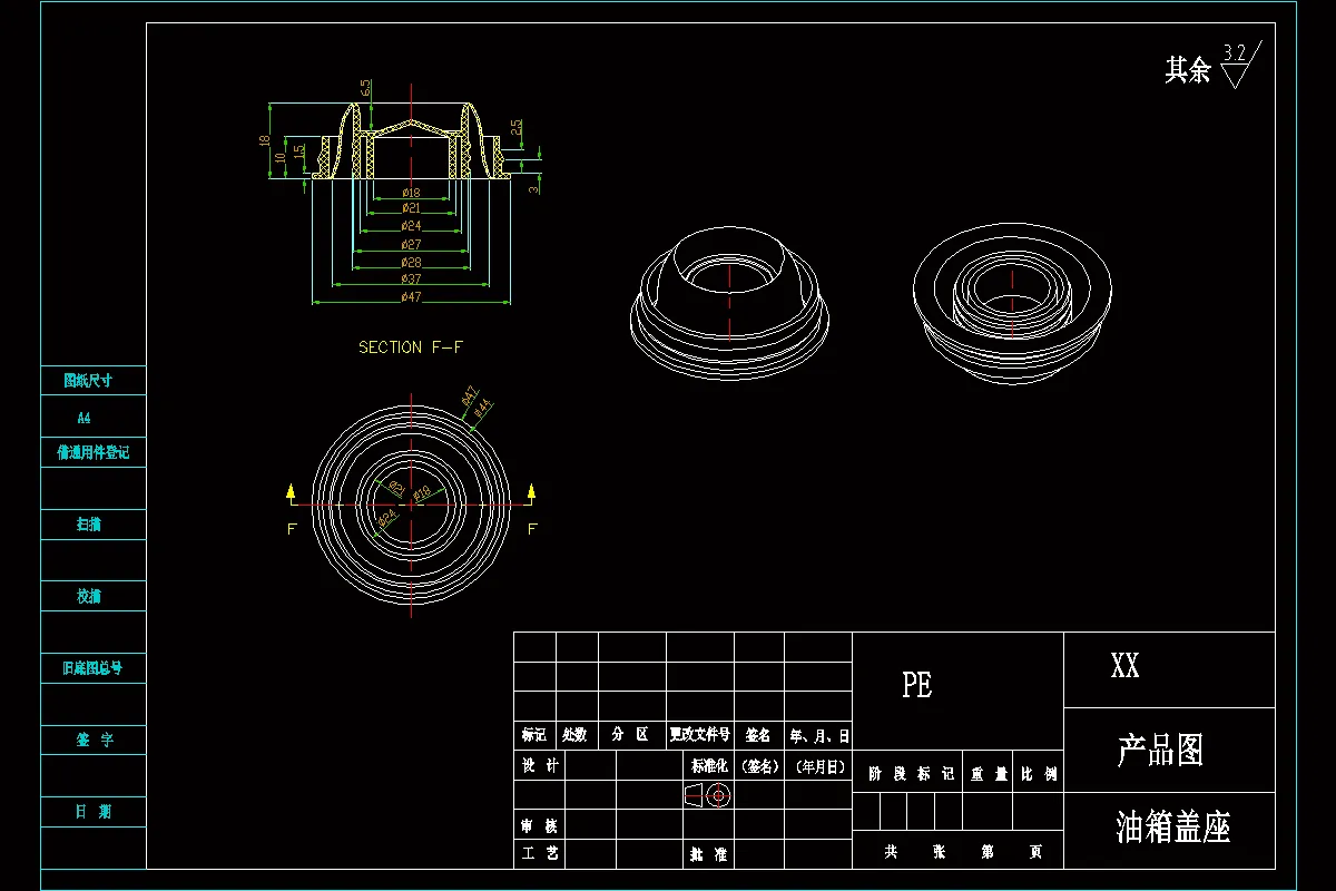 关键词:油箱盖座;一模两腔;侧浇口进料;注射机;冷却系统,注塑模具。