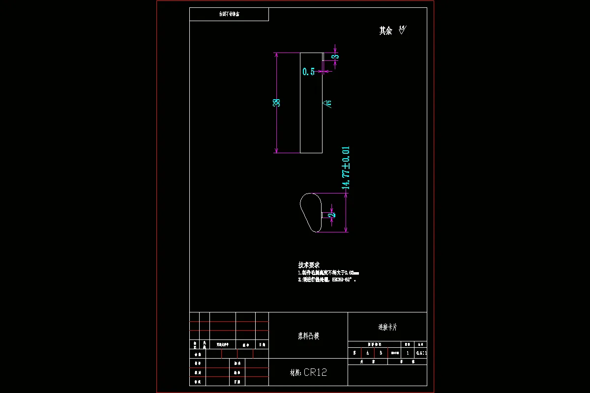 本次课题为连接卡件冲压工艺及模具设计,通过对深入学习,对此零部件模具设计时的设计方式有了雏形。,先分析零件的冲压工艺;确定模具的总体结构;结合零件的冲压工艺及模具的总体结构设计排样图;根据排样图,计算利用率、冲载力、压力、选用设备及刃口的尺寸。根据资料再用AutoCAD,对模具进行设计,然后绘出装配图和零件图进行标注,并编制零件的加工工艺卡,使理论和生产实际知识综合运用,从而培养和提高了我独立工作的能力。