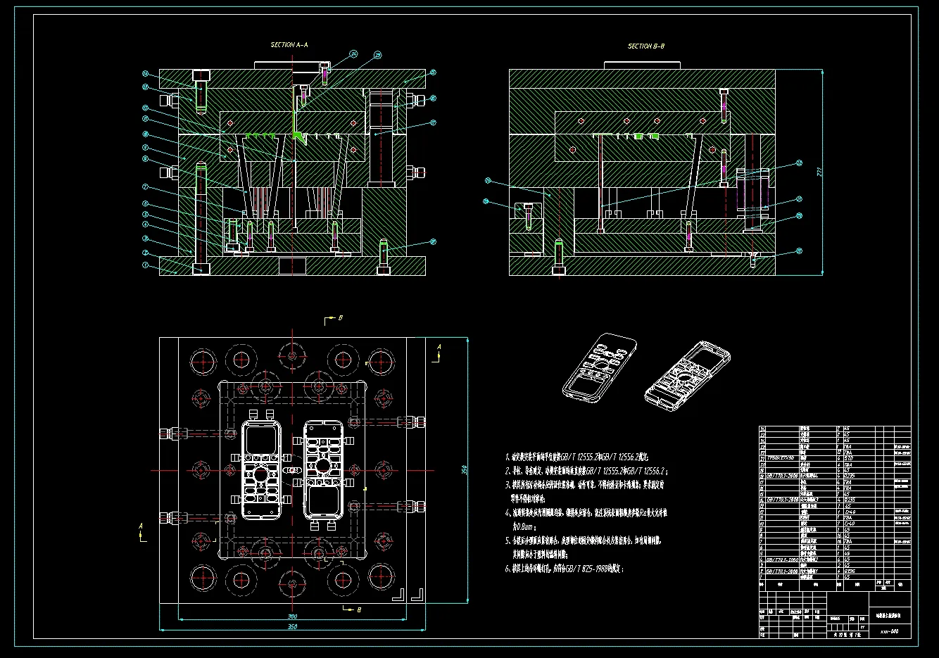 本设计为遥控器面板注塑模具设计,它介绍了注塑成型的基本原理,课题任务书要求是对一种遥控器面板进行合理结构的模具设计,分析塑件的材料和结构后,可以知道这一类的产品都是需要采用注射模具的成型工艺来生产的产品,这次主要是用电脑绘图完成这次课题设计。注塑模具现在使用的比较多,主要是针对产量高的塑件产品使用:特别适合精度要求搞,需求量又大的这一类塑胶产品比较适合,这样来生产又可以保证产量,也可以保证使用功能不受影响。注塑模具的应用用途也很广泛,基本所有的塑料材料都可以生产,模具质量可靠的前提下,产品的质量也会很高,而且可以实现自动化生产。这次设计过程主要分为几部,先分析产品结构性能,然后三维UG软件进行建模,然后分模,画出主要的成型零件,在这之前需要进行一系列的计算,保证自己设计的强度是可以满足要求的、而且需要选择好成型模具的穴数,这个主要按照产品的结构和注塑机的大小决定是否合适,后面设计好装配图,然后还需要设计出来模具的各零件的细节,然后吧那些零件的图纸转换成CAD的二维工程图,做完图纸,需要整理好之前的设计计算。把这些计算都写说明书,按照规定的格式完成设计说明书的排版。