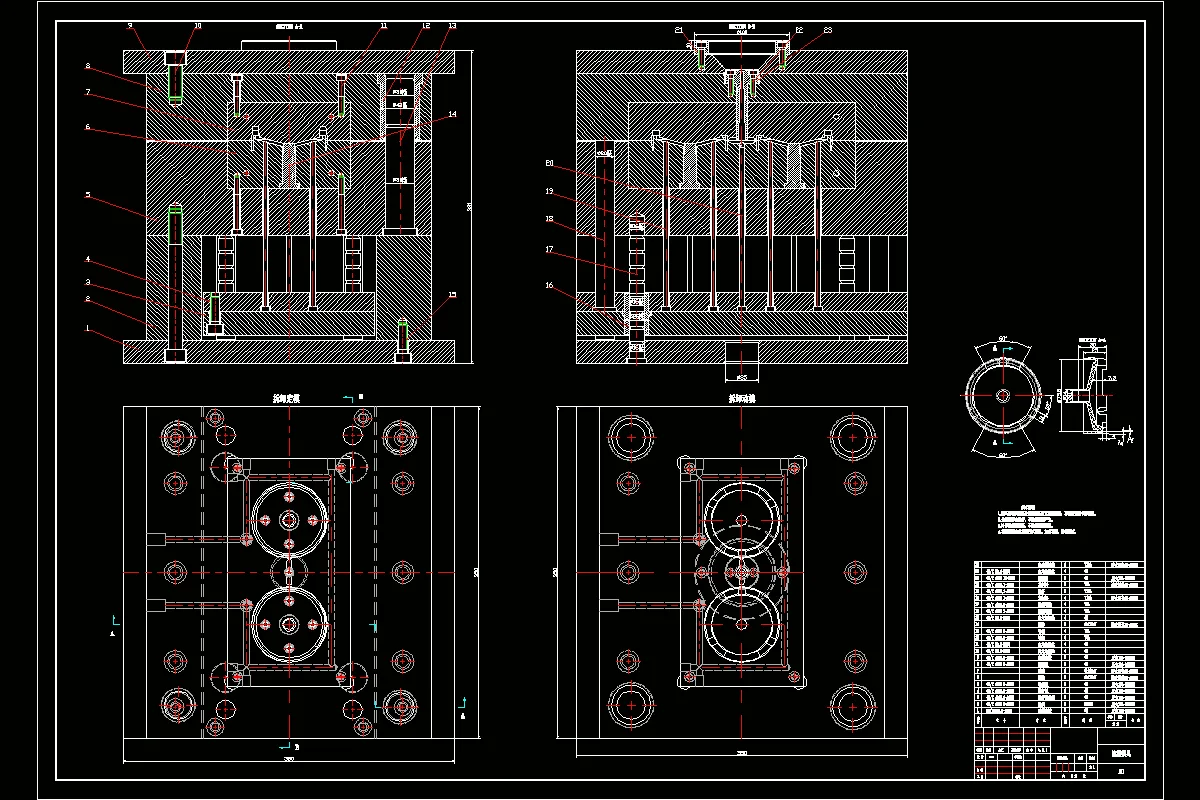 在设计过程中,为了更清晰地表达的模具的内部结构,所以有很多的模具结构和模具的局部图,并通过其CAD二维图。