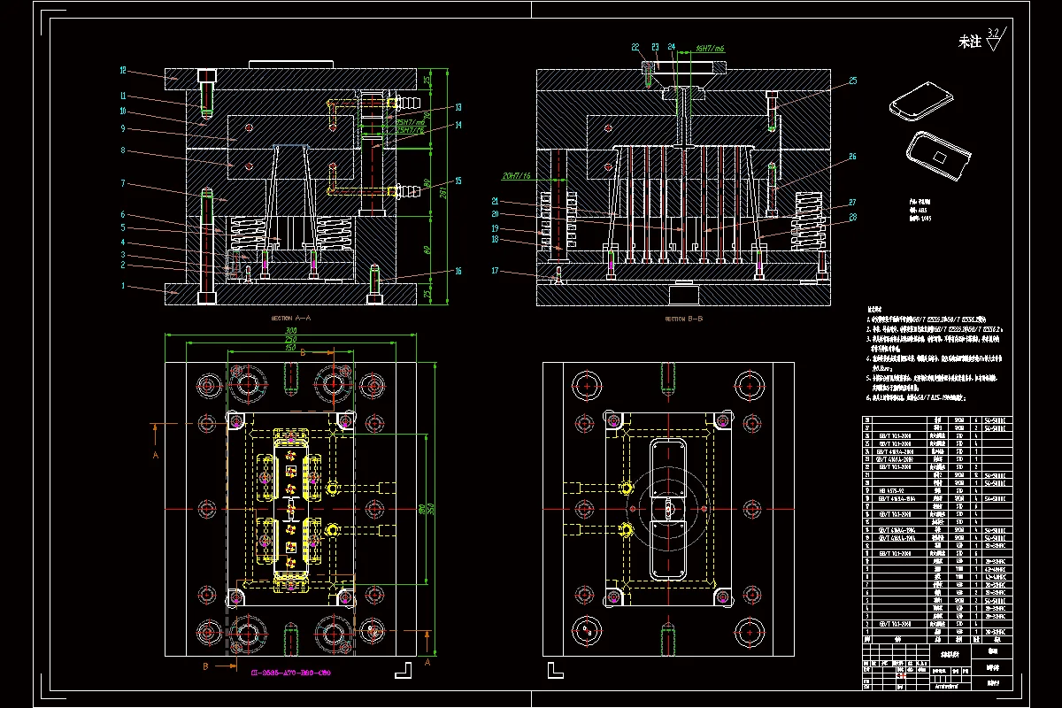 当画出塑件三维图了以后,确定塑件分型面为最大端面处,这样更还直观的可以看出开合模间隙。分型面确定好了以后有就开始型腔布局,如何更加经济和布局的时候需要考虑到之后型芯型腔的机械加工,经过分析布局为一模二腔的布局。再者就是设计流道的时候尽可能考虑到经济方面,流道尽可能不要太长,不要留有过多的废料。最关键在于成型零部件也就是型芯和型腔,设计的时候要额外仔细,数据把控需要很严谨,还有就是距离把控好,这直接关系到了塑件生产出来的质量以及外观。采用分布均匀的布局水道,充分冷却产品即可。然后顶杆布局需要受力均衡,顶出产品保证产品无顶白或者顶穿的情况,再设置弹簧,打螺丝,垃圾钉等等。设计完了以后仔细检查,再通过注塑机进行校核参数是否符合,计算相关尺寸。最后可以导出二维图也可以看见模具结构相互之间是否有干涉,或者遗漏相关的配合块等等,等确定无误以后再在CAD二维图里面进行标数,整理好相关图档、资料。