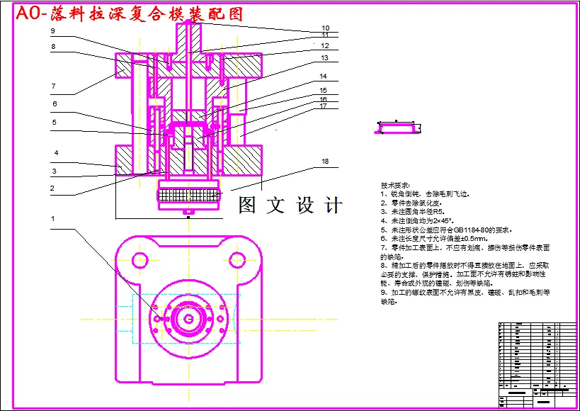 为了得到本道工序所要求的形状,要对该带凸缘的锥形拉深件的顶面进行局部拉延的变形加工,其成形特点为伸长类成形。伸长类成形的破坏形式主要是由于材料的延伸率不足而造成的破裂,当其各部分材料伸长不均匀时,常伴有起皱、翘曲等缺陷。对于该种破裂的成形,常用其变形前后的相对伸长与材料延伸率之比来衡量成形极限。由于该零件采用08号钢进冲压成形,材料的延伸率较大,朔性较好。经过初步的估算可知,该零件的成形工艺性较好。根据前面确定的数据对照参数表选择模架,落料拉深复合模及二次拉深模的模架相同,上模座尺寸为250mm×250mm×50mm,下模座尺寸为250mm×250mm×60mm。1107031