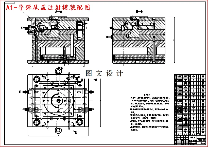 本设计是对产品导弹尾盖的模具的设计,通过对于导弹尾盖的AutoCAD图纸进行分析可知:该塑件几何尺寸较大,且壁厚薄厚不一,使得该塑件成型及冷却较难;塑件形状较为复杂,侧壁有不规则突起,中间有半封闭腔,使得脱模较难。因此,在设计时要着重对于这一难点进行仔细研究分析:对于塑件成型困难的问题,选用加工精度较高的模具钢,以确保塑件顺利成型;对于塑件冷却问题,采用常温水冷冷却水道,在较厚处重点冷却,使其冷却快速均匀;对于塑件脱模问题,采用活动型芯拼接的方案,对于塑件侧壁有突起通过设计侧向抽芯机构进行解决。