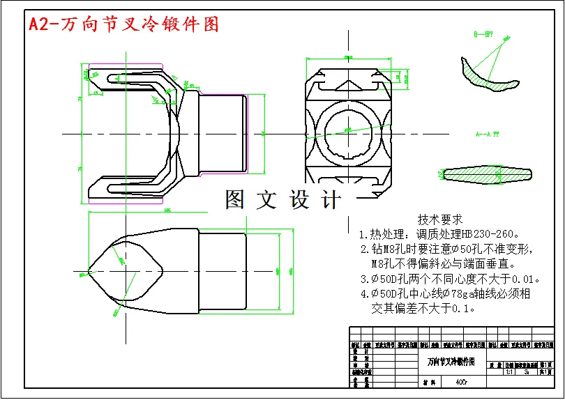 零件为万向节叉,万向节叉是叉形件。是用在解决主动轴与从动轴轴心存在一定角度,允许被连接的零件之间的夹角在一定范围内变化,承受的转矩比较大,工作条件比较繁重,在不平行的情况下起到联结主、从动轴的作用的器件,也就是通过万向节主动轴将力矩传给从动轴。除了汽车的传动装置,在其他工业甚至民用传动领域的应用范围极为广泛,基本上,只要有以下情况均可使用。对零件的整体形状尺寸,表面粗糙度进行分析:头部构造比较复杂,只能锻造出其零件基本外形,其它孔部、球形滑槽及花键槽部分均以余块填充,之后再以机械加工做出具体形状,达到要求的零件形状;零件的机械加工精度应低于Ra1.6;零件的材料为40Cr,材料性能稳定。
