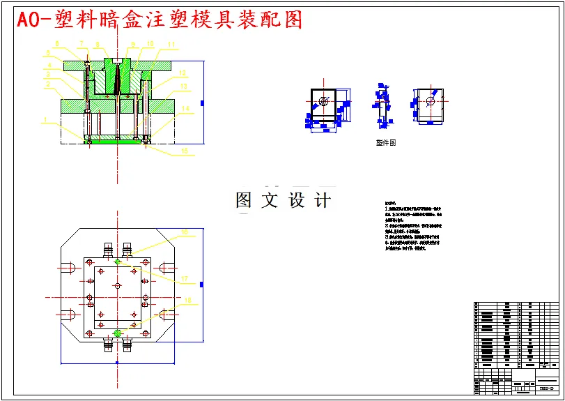 本设计系统阐述了塑料暗盒注射模设计过程,根据塑料暗盒注射模的形状和生产要求,编制塑料暗盒模具的设计过程,初步制定了总体模具的设计方案。首先对塑料暗盒模具进行了详细的工艺性分析,然后进行注射模结构设计,接着对整个模具的进行相关校核,最后完成整个塑料暗盒模具设计,并绘制出模具的总装图和非标准件的零件图。本设计方案结构紧凑,满足制品大批量生产、高精度、外形复杂的要求,设计参考了以往注射模具的设计经验,并结合制件性能,简化设计机构,并且运用AutoCAD等软件进行绘图,缩短了生产周期,并且获得良好的经济性能。