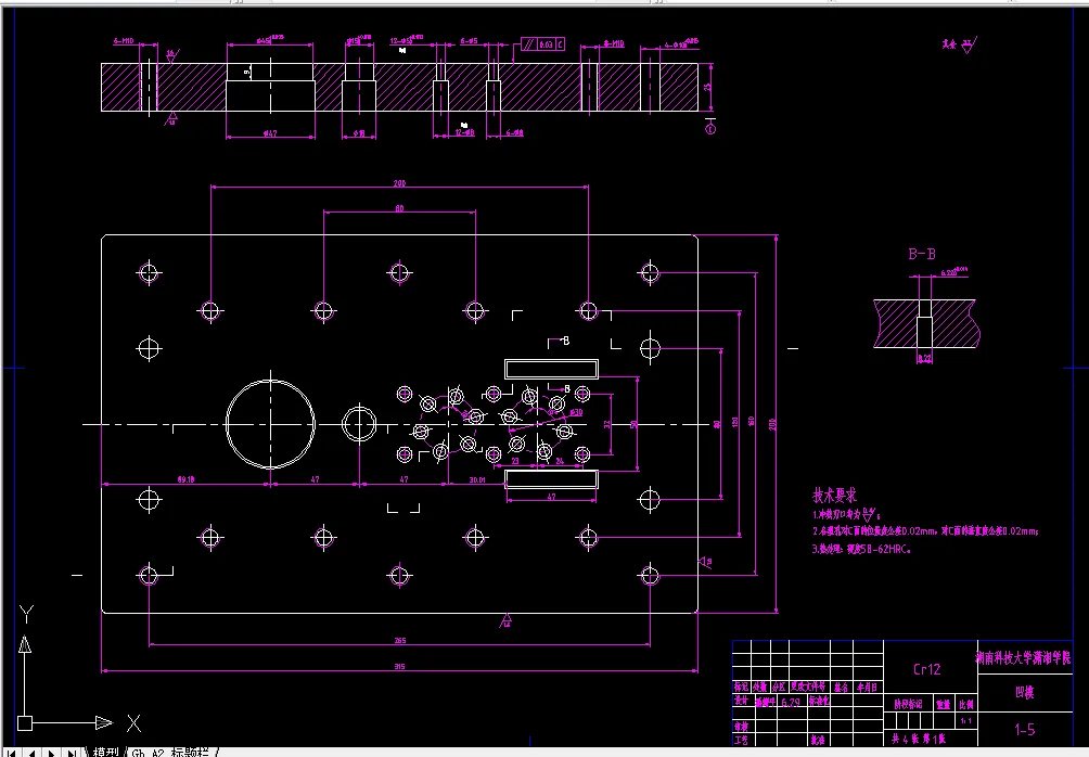 通过对多孔花片零件的冲压工艺进行了分析,确定了合理的工艺方案和冲压过程。其冲压过程:1.冲六个直径为5mm的孔,同时冲两个直径为5mm的定位工艺孔;2.冲另六个直径为5mm的孔;3.冲直径为15mm的孔;4.落料多孔花片。此连续冲压工艺可以明显的提高零件的生产率。简述了多孔花片冲模的排样图、冲压力以及压力中心等工艺计算。文中详细介绍了该级进模模具结构的总体设计及主要零部件的设计。最后,填写了冲压工艺卡和凸、凹模的机械加工工艺过程卡。