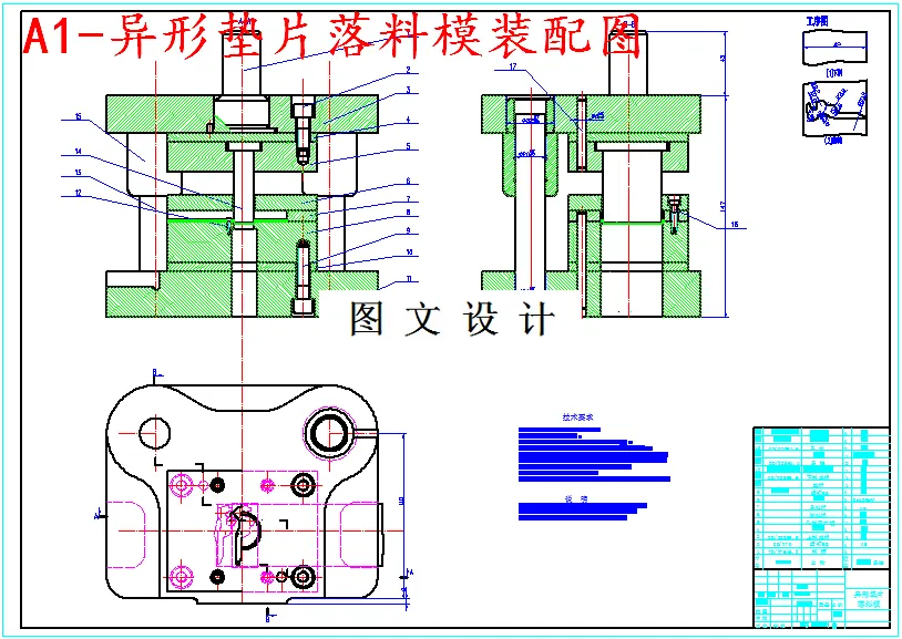技术要求 1.压力机为开式可倾工作台压力机; 2.模座的平行度小于0.8mm; 3.模柄的中心线对上模板的垂直度不大于0.8mm; 4.导柱距下模板的距离为1mm,导套距上模板的距离为1mm; 5.为了使润滑剂流入凸、凹模刃口侧面及模具活动部分,在压料板 以及顶板内外形口部,都带倒角,使涂在冲压材料表面的润滑剂受 压后,就能沿倒角流入模具,润滑模具活动部分; 6.模柄孔直径Φ30mm,深度50mm。; 7.螺钉和销钉都选择标准件,保证螺钉拧入深度大于1.5倍的直径。 说 明 本模具是一套落料模。采用手动送料的形式,当条料 从模具右方送进时,首先依靠固定挡料销12,导料板7 对条料进行定位后落料。零件从模具下方取出。