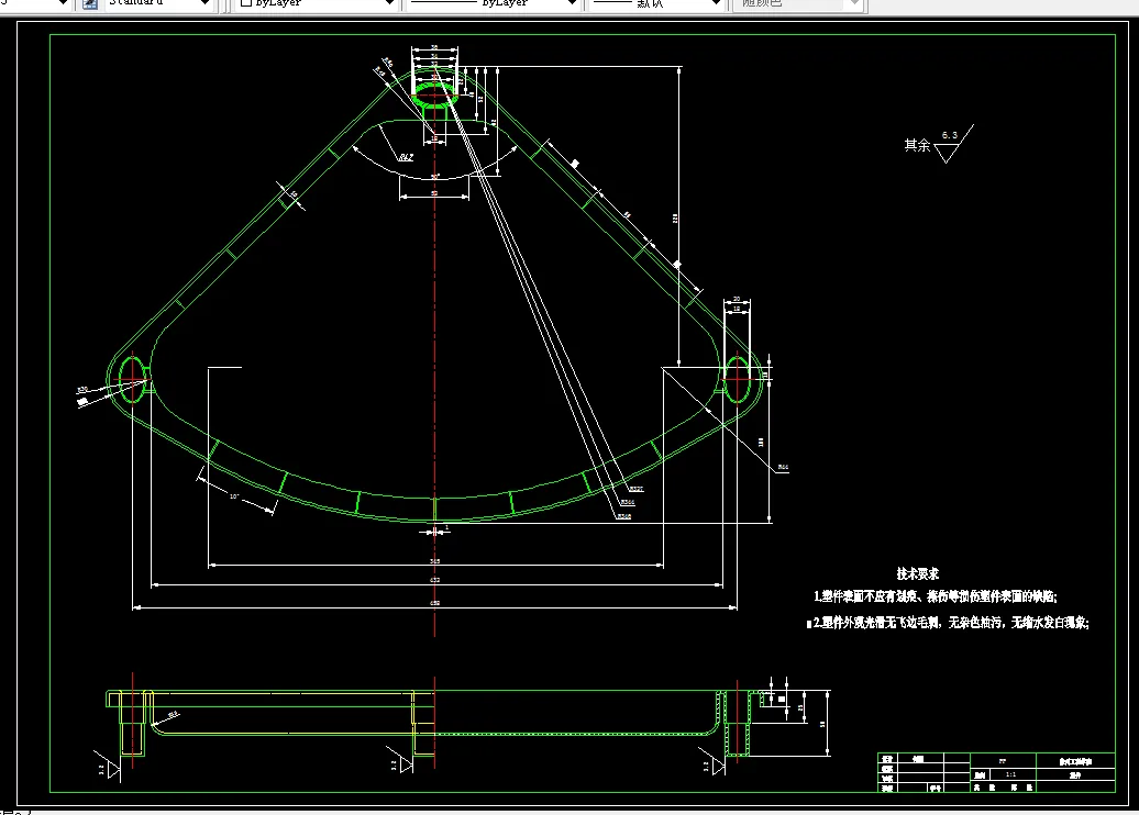 塑件形状:该制件为洗衣机手柄,最大外形尺寸为105mm,壁厚为2.5mm,总宽为41mm,总高为15mm,,形状为方形壳体。为了不影响塑件的外观,故采用矩形侧浇口,采用单分型面,基于分型面的选择原则,分型面可以选择在手柄壳的顶面。考虑到塑件的尺寸,在此采用一模两腔。采用带Z形头拉料杆的冷料穴,这是一种较为常用的冷料穴,其底部作成钩形。塑件成型后,穴内冷料与拉料杆的钩头搭接在一起,拉料杆固定在推杆固定板上。取塑件时须朝钩头的侧向稍许移动,即可将塑件与凝料一起取下。