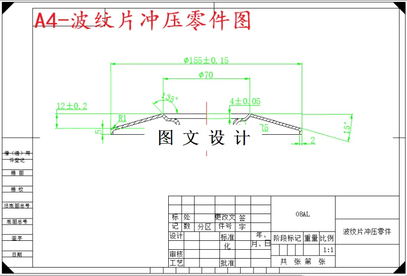 本文介绍了波形片成形工艺制定及模具设计。设计内容包括产品零件工艺分析、模具设计以及主要零件制造工艺的确定等。 此零件结构复杂,需要多道工序完成,基本工序包括落料、锥形拉深、冲孔、翻边、弯曲等。针对此产品件,应明确设计路线,确定设计方案,构思模具结构。首先对产品进行结构和尺寸分析,利用AUTOCAD绘出零件的三向视图,确定尺寸;之后确定优选的工艺方案(落料、锥形拉深、冲孔、翻边、弯曲、修边);然后再进行必要的工艺计算和尺寸计算,利用AUTOCAD完成第一道工序—落料拉深复合模装配图,并绘出各非标零件;然后同样用AUTOCAD完成第二道工序—冲孔模;对其它工序进行分析,确定每道工序的细节工作;最后完成设计。