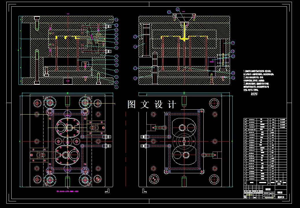 电饭煲控制盒底座注塑模具设计图纸,模具采用两板式结构,分型面选在塑件的最大外轮廓,型腔数量采用一模两腔的结构形式;冷却系统采用冷流道浇注系统,矩形侧浇口。脱模机构为推杆推出机构。