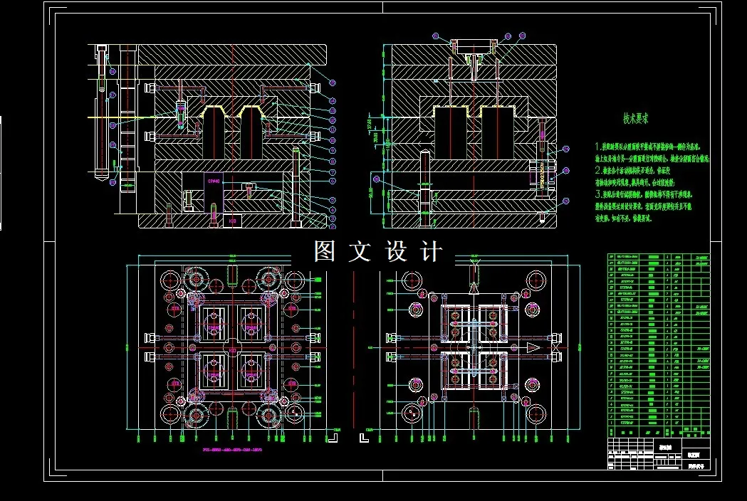 塑料壳体注塑模具设计图纸-一模四腔。点进胶,推杆推出的设计方案,图纸做的比较精细,欢迎下载学习,塑件形状较简单,重量较轻,生产批量较大。所以应使用多型腔注射模具。所以模具采用一模四腔、双列直排,推件板推出,流道采用平衡式。这样模具尺寸较小,制造加工方便,生产效率高,塑件成本较低。