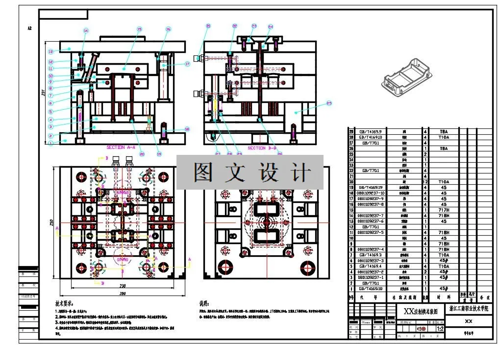 在本设计中进行了塑件工艺性分析、总体方案的设计、注塑机的选择、浇注系统的设计、成型零件的设计、脱模机构的设计、侧抽芯机构的设计及计算、导向和定位机构的设计、模架的选择、冷却系统的设计和计算等设计工作。在本次设计中,需要加工的工件有侧孔,采用了一个由侧型芯、固定件、挡块组成的侧抽芯机构,避免了采用斜导柱结构。