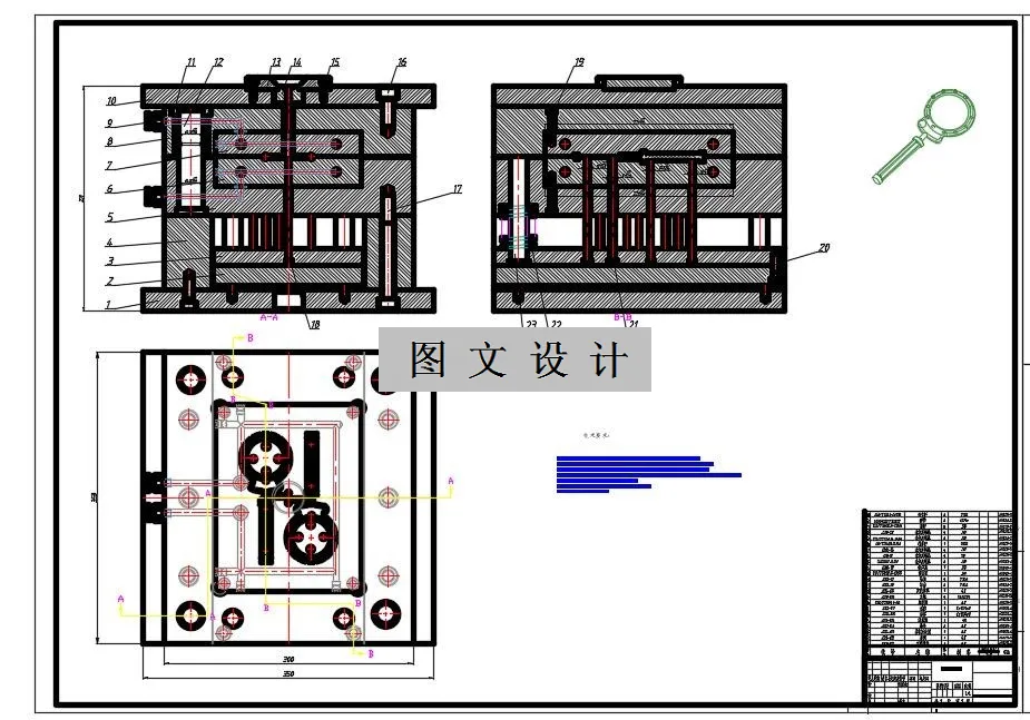 工作原理:合模后,从注射机喷嘴中注射出的塑料熔体经由开设在定模上的主流道进入模具,再经由分流道及浇口注入和充满型腔。在保压、补缩和冷却定型后,合模系统便带动动模后退,从而使动模和定模从分型面分开,浇注系统凝料在拉料杆的约束下从浇口套中脱出,并和塑件一起随动模运动,使型芯脱离制品,当动模后退到一定位置时,内部推出脱模机构会在注射机推出装置作用下与动模其他部分产生相对运动,利用推杆使制品和浇注系统凝料从型芯上以及在动模一侧的分流道中推出脱落,制品脱出后,带弹簧的复位杆会带动脱模机构优先复位,然后滑块在斜导柱的作用下复位,从而完成一次注射成型过程。