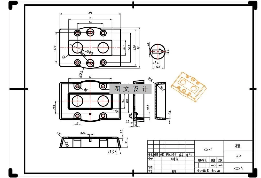按钮A外壳注塑设计是常规的梯形的外壳,塑件上面有两个孔,设计采用一模2腔,侧浇口,进行设计,全套设计资料有塑件ug三维cad装配图,加设计说明书。1460155