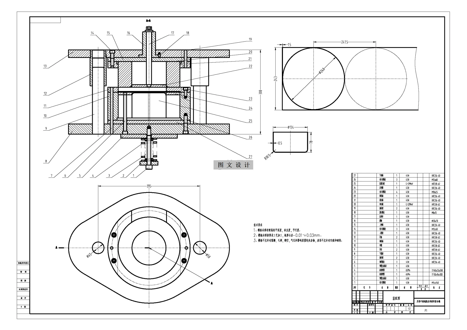 设计首先对冲模的基本成形机理及现状发展趋势做出简要阐释,指出冲模是一种低能耗高效率的产出方式,在综合分析产品工艺性指标及对比不同结构预案后,确定本次工件易采用连续模具的方案进行。 模具设计之前进行了排样结构设计和工艺计算两部分内容。第一部分通过排样参数选用和工件各工位的合理分解排布确定了包含冲裁,冲孔弯曲落料在内的多工位的合理结构,并以此为基础进行了第二部分,主要涵盖材料利用率,基本冲裁力参数,刃口精度公差等几部分的计算与校核,为后续模具结构具体实施打下基础。模具结构设计是在确保总体原则的情况下针对凸模,凹模,以及凸模固定板,辅助部件这几大方向完成了本体参数的设计和选用,最终将他们合理的装配,完成了本次工件级进模结构的设计。最后选用合理的压力设备与模具适配,以满足后续试模的需要。 在此次的设计当中,我翻阅查看了大量的模具设计资料,在异形不锈钢成形模具的设计与应用当中,和以前的设计方法相比较而言,模具的广泛应用,使得产品的质量得到了巨大的提升,模具的创新思路以及要求要紧跟现代化的步伐下,需要与未来的发展相结合。 本次设计的内容为异形不锈钢成形冲压模,完成冲孔、落料、拉深三道工序。使用AUTOCAD软件完成零件的绘制并完成装配图的绘制,进而完成装配工程图和相关的零件图。