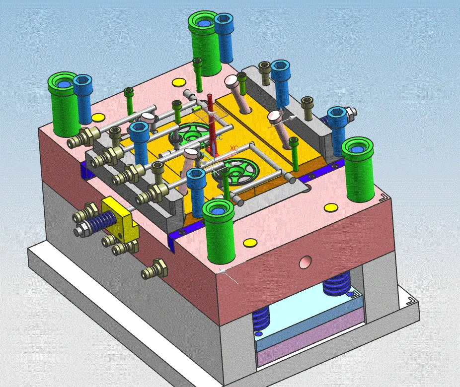 参考资料为玩具车轮帽轮毂注塑模具设计主题。模具为一模两腔,侧浇口,塑件上一圈侧凹结构采用斜导柱抽芯机构成型,产品中部采用推管,周围几条条幅上采用推杆推出,本资料含有产品零件图、模具装配图、模具三维、多张模具零件图