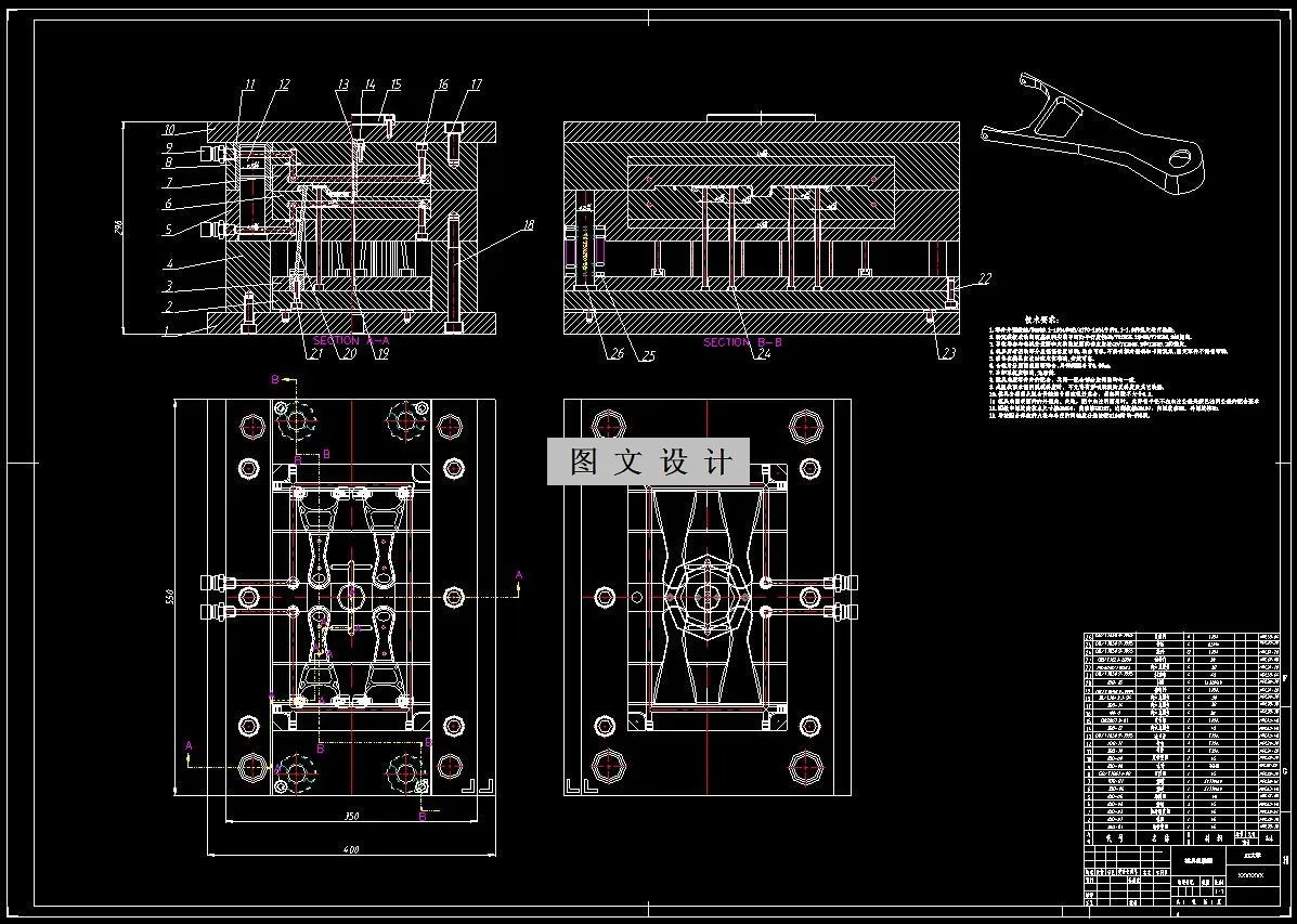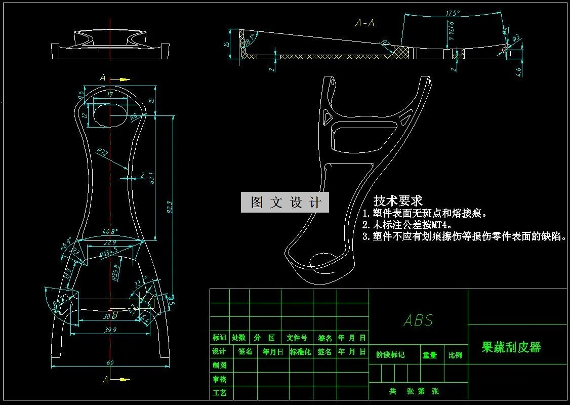 本设计是注塑模具设计为主题。其设计思路由参考多个生产事例而得出,设计内容是从零件的工艺分析开始的,根据工艺要求来确定设计的大体思路。在设计当中,很多东西都是自己原来所没有接触过的,尤其是前段时间所学的理论课知识与现在的自己动手操作设计,设计顺序开始是从零件的材料选择,接下是成型参数、密度、收缩率的确定,模具种类与模具设计的关系、塑件的尺寸精度与结构、注射机的选择、模具设计有关尺寸的计算(包括模具型腔型芯的计算及其公差的确定)、注塑机参数的校核、模具结构设计、模具冷却、加热系统计算、注射模标准件的选用及总装技术要求等内容。 其次是模具的结构,在模具结构的设计当中,首先设计的是模具的型腔结构,接下来是型芯结构、斜导柱、滑块、导向机构、复位杆、拉料杆、推件杆和推出机构,这样做的目的是为了规范化,更重要的是为了以后与制造人员的配合。既让自己有了良好的设计习惯,又能锻炼自己的配合意识。为以后工作做一次演练,这样更能体现理论与实践相结合的目的