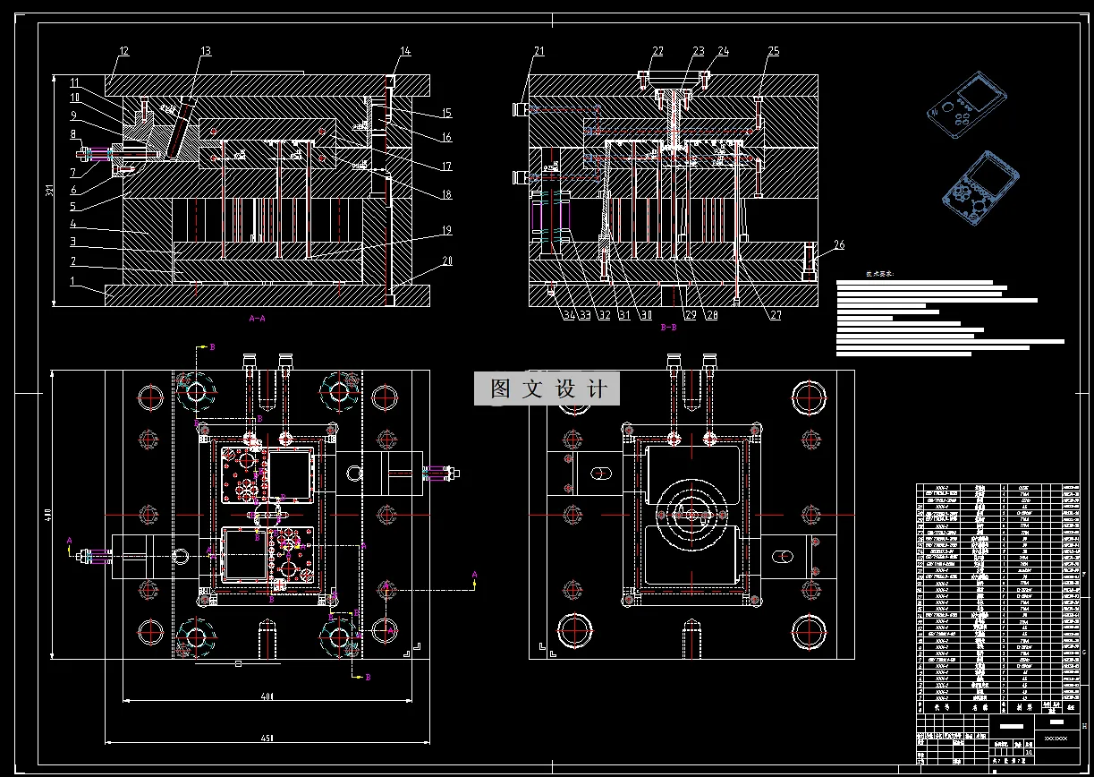 本次设计主要内容为成型微型游戏机外壳正面外壳设计一套塑料模具方案,在开展方案设计之前首先对微型游戏机外壳正面外壳结构做出了分析,然后根据其使用要求为微型游戏机外壳正面外壳选择合适的ABS材质,本次设计型腔数目为一模两腔的结构,本次设计中浇口形式采用了潜顶杆浇口进胶的方式,通过UG软件分析获得了产品体积,并对本次模具选定了型号注塑机及龙记标准CI模架型号。确定了模具最佳分型面位置,然后对主要的模具结构比如浇注系统、脱模机构、模具冷却系统进行详细的设计及计算。在成型零部件设计时,对成型零件的结构形式做出了选择并对成型零件的成型尺寸进行计算。最后对所选注塑机型号进行了校核。在本次设计过程中,运用大学时期所掌握的UG和CAD计算机软件辅助设计,高效的完成了模具装配图和模具零件图的绘制,顺利的完成本次毕业设计任务。