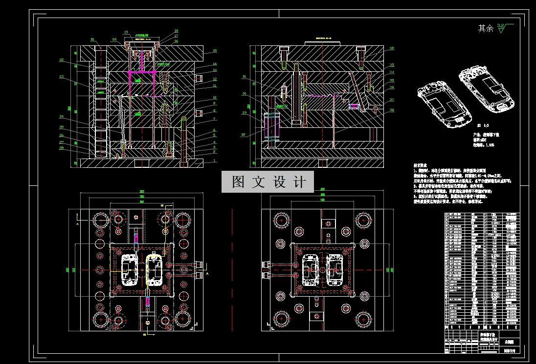 控制器下盖注塑成型工艺采用一模两腔、三板模点浇口设计,实现多次分型。模具利用推杆顶出、斜导柱滑块抽芯及斜推杆抽芯机构,确保产品顺利脱模。此设计提高生产效率,保证下盖尺寸精度与外观质量,适用于控制器下盖的大规模制造。