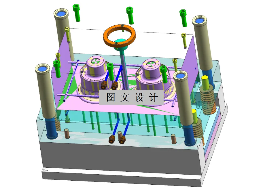 台灯灯罩注塑模具设计,一模两腔布局提升生产效率,侧浇口设计优化塑料填充,推杆顶出机构确保制品顺利脱模,