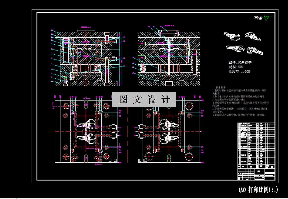 本次选题的是玩具扳手模具设计与模仁加工,首先我们要确定好塑件的成型材料,根据查阅文献资料显示,一般的玩具都是选用ABS材料,因此我借鉴了文献的资料最终确定为ABS,接着利用3D扫描仪器对玩具扳手实物进行扫描,然后通过点云的绘出三维塑件图。画好三维塑件图之后通过UG进行对塑件的分析,确定玩具扳手的分型面以及型腔型芯的成型结构。利用模流分析软件对玩具扳手塑件进行模拟分析,然后对三维塑件图分析出来的缺陷进行解决。确定好设计的腔数选择合适的模架,通过UG软件绘出型腔、型芯、冷却系统、顶出系统、浇注系统、排气系统等等,最终完成本次模具设计的整套3D图,最后选择合适的注塑机。