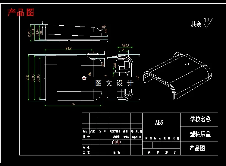本文主要是关于塑料后盖的注塑工艺的分析及模具设计。首先,对注塑工件进行了结构和工艺分析,确定了最佳成形方案;对整个塑件成形过程进行了模拟分析,预测了成形过程中可能出现的问题。根据分析结果,利用UG,完成了注塑模设计。 关键词:塑料后盖;UG;注塑模